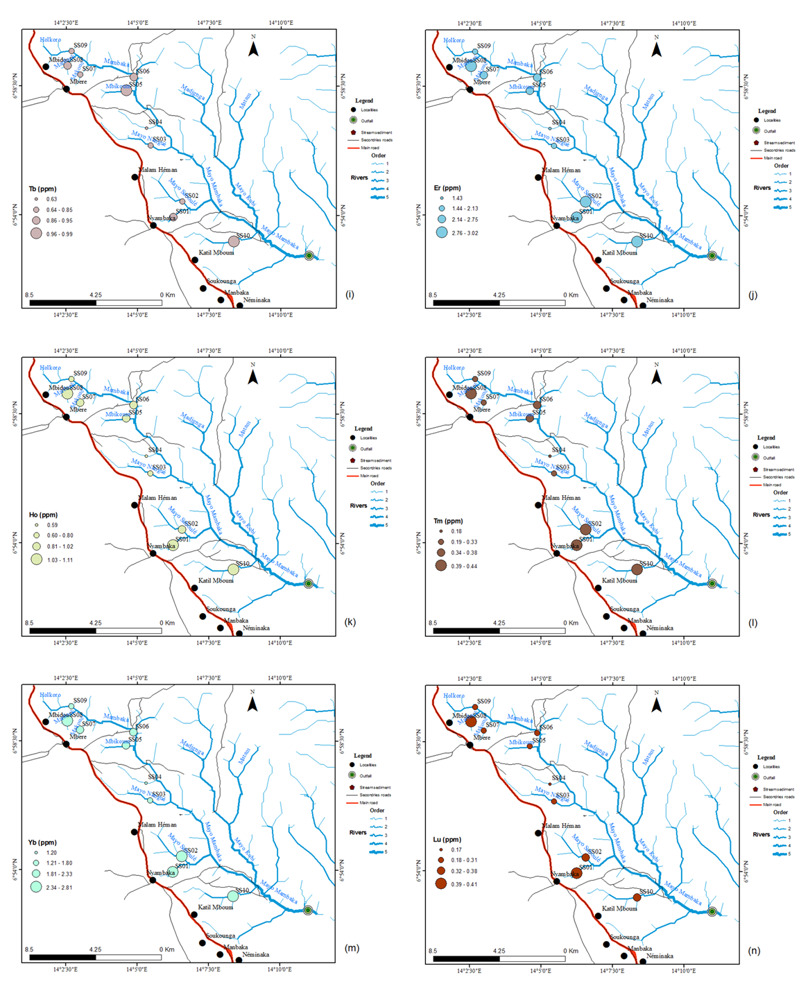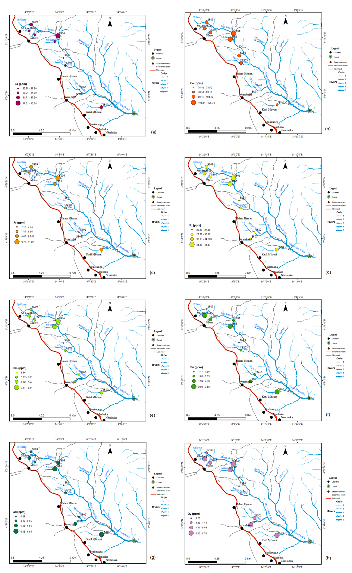However, the aim of geochemical prospecting is to: Locate primary dispersal aureoles by studying the distribution of chemical elements in the deposit's host rocks; locate so-called secondary dispersal aureoles and high-grade zones that develop along watercourses in stream sediments and on mountain slopes, by studying the distribution of elements in soil and stream sediments. For this reason, stream sediments are the most widely used sampling media for regional geochemical studies around the world for the delineation of potentially mineralized zones (anomaly detection), but also for the definition of basic geochemical conditions (the baseline analysis, [9]). In addition, they can locate areas contaminated by anthropogenic factors [10]. This work makes a contribution to the identification of rare earth geochemical anomalies, their origin, formation processes and associations in stream sediments in the west of the Mambaka watershed in Nyambaka locality (south of Ngaoundéré).