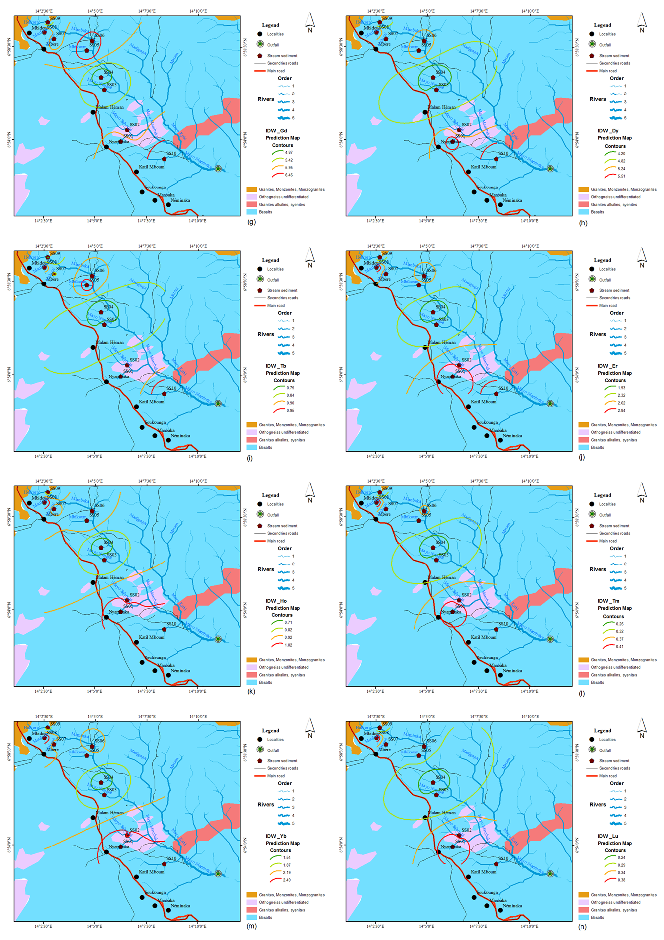 Appendix A: Rare earth elements distribution maps: (a) La, (b) Ce, (c) Pr, (d) Nd, (e) Sm, (f) Eu, (g) Gd, (h) Dy, (i) Tb, (j) Er, (k) Ho,(l) Tm, (m) Yb, (n) Lu