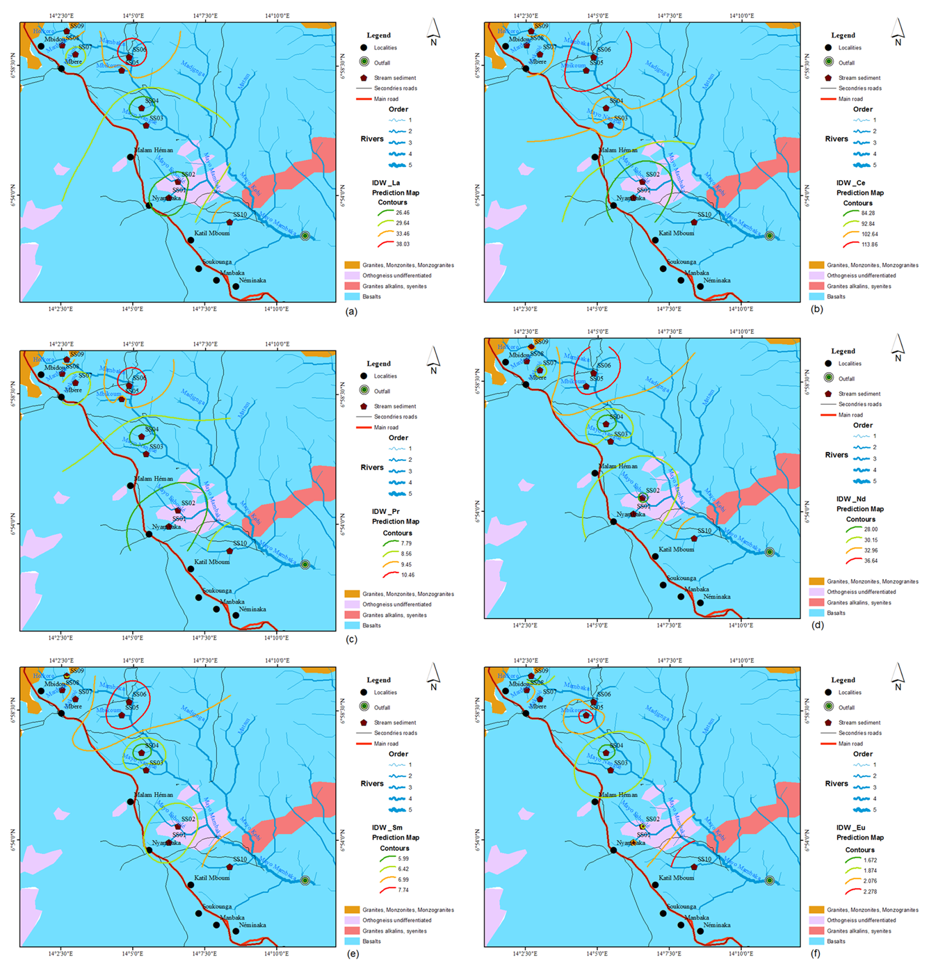 The average lanthanum (La) content is 31.05 ppm. This is significantly higher than the lanthanum (La) content of the upper continental crust (31 ppm) (Appendix A (a)). The highest content is observed in sample SS06 and the lowest in SS04, both of which occur in a basalt-covered zone (Appendix A). The maximum Lanthanum (La) content is higher than in the watershed south of Nyambaka commune, where the value is 42.40 ppm [36], and lower than in samples NT18 ( 3122.6 ppm), NT05 (1867.7 ppm) and NT26 (556.8 ppm) studied in stream sediments in the Paleoproterozoic series of the Nyong, South Cameroon [33]. Sample SS06 has a higher content (43.50 ppm) than the North East (32.15 ppm), North (20.39 ppm), West (26.51 ppm) and North West (22.98 ppm) samples from the Baotou mine soils in China [50]. Lanthanum shows a positive Pearson correlation coefficient with Ce, Pr, Nd and Sm. The enrichment observed in the river hosting the sediments of sample SS06, a tributary of Mambaka, as indicated by the inverse distance interpolation predictive maps IDW_ La (figure 13 a) and IDW_FAC_2, could originate from the basalts and granitoids where the hydrothermal fluids flowed (Appendix B (a)).